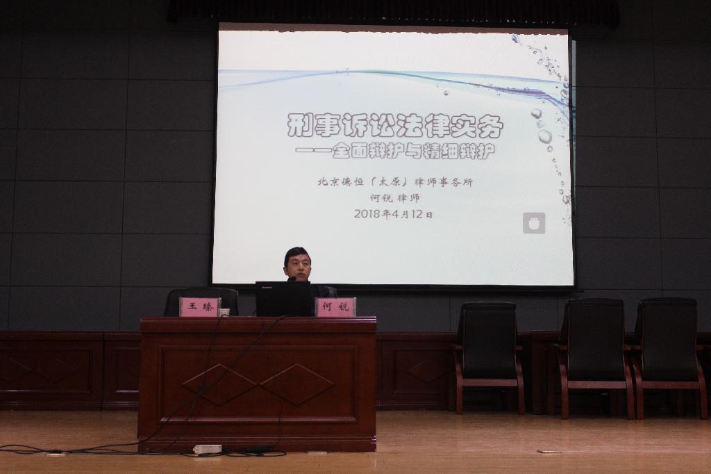 4月12日上午,学院邀请北京德恒(太原)律师事务所何锐律师在图书馆学术报告厅作了题为《刑事辩护法律实务——全面辩护与精细辩护》的学术报告,www.bt365.com全体法学系师生聆听了报告。院党委副书记王臻主持报告会。