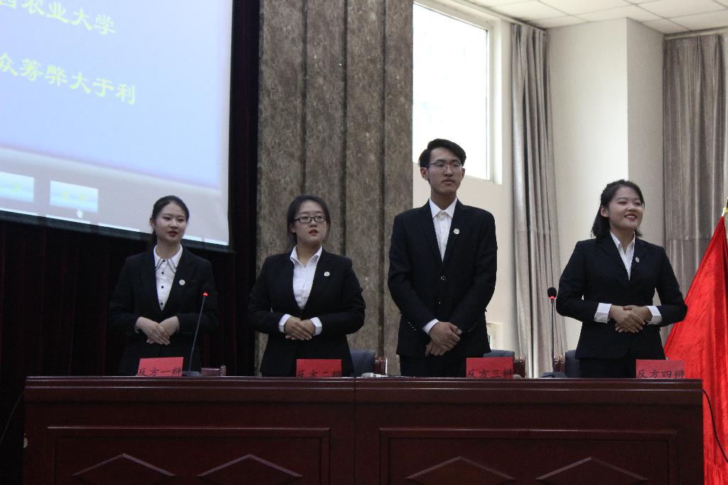 决赛中,我校代表队迎战山西财经大学代表队,双方辩题为“公益众筹是利大于弊还是弊大于利”。我方持“公益众筹弊大于利”的观点。四位同学沉着冷静,他们在各自的规定时间内大显风采,无一不展现出他们的上佳的口才与敏捷的思维。在立论阶段,双方一辩破题立论,从容阐明各自观点,逻辑清晰,有理有据;攻辩阶段,双方辩手运筹帷幄,你来我往,辩驳犀利而又不失风范。在最激动人心的自由辩论环节,四名辩手紧密配合,环环相扣,打出了一个个组合拳,充分展现了团队的高度默契,他们精彩的表现赢得了现场观众的阵阵掌声,也将比赛推向高潮。最后,双方四辩的总结陈词各具风采,精辟到位。