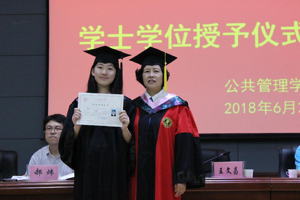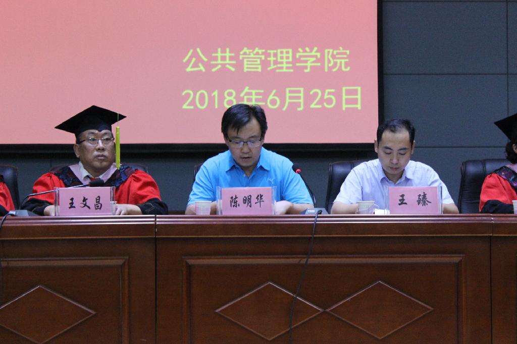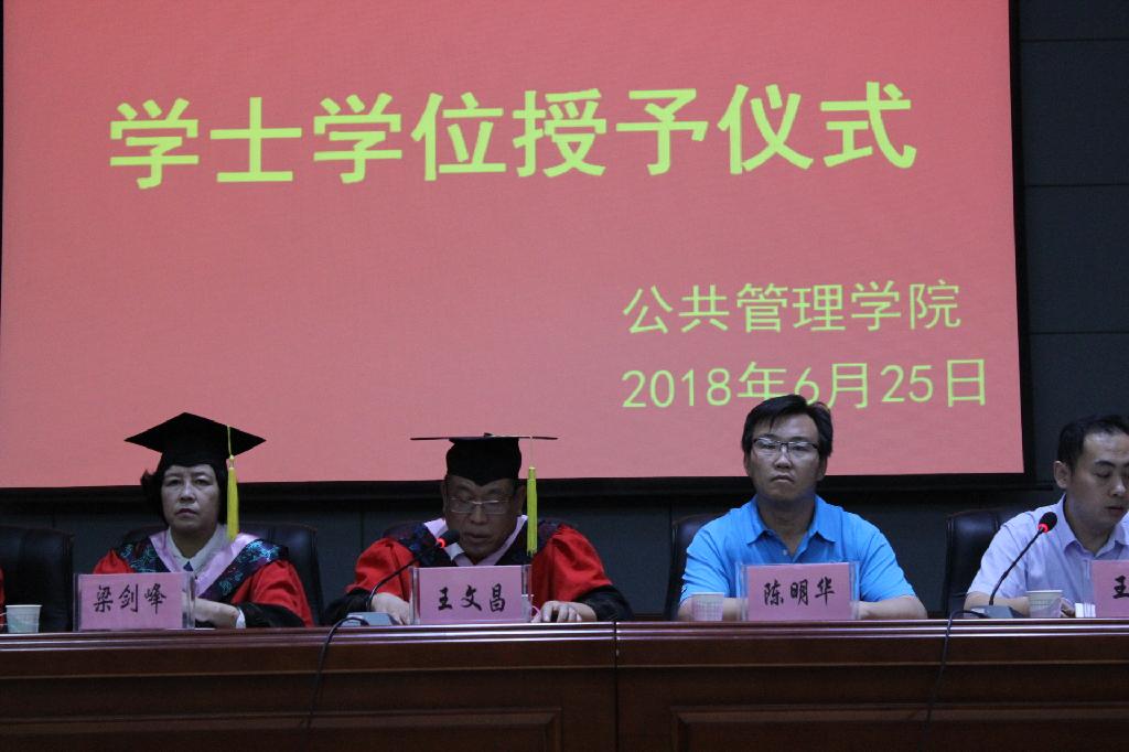 院党委书记陈明华宣读学士学位授予决定,授予350名同学学士学位,其中,授予117名同学法学学士学位,授予233名同学管理学学士学位。